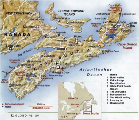 Nova Scotia gehört zu den Atlantik-Provinzen Kanadas und liegt auf der gleichen geographischen Breite wie Südfrankreich. Mit fast 53000 Quadratkilometern ist Neuschottland größer als die Schweiz, hat aber nicht einmal eine Million Einwohner, ein Drittel von ihnen lebt in und um Halifax. Die Bewohner sind mehrheitlich Nachkommen schottischer und englischer sowie französischer Siedler. Die Macmacs, die indianischen Ureinwohner, leben in Reservaten. Die wichtigsten Einnahmequellen sind Tourismus, Holzwirtschaft und - immer weniger - der Fischfang. Nova Scotia liegt in der Atlantic Time Zone, das bedeutet MEZ minus fünf Stunden. Die besten Flugverbindungen zum Halifax International Airport, ca. 40 Kilometer nordöstlich der Hauptstadt, bietet Air Canada, täglich von Frankfurt und Zürich nach Toronto und von dort weiter nach Halifax, im Sommer zweimal wöchentlich direkt von Frankfurt nach Halifax. Im Sommer bestehen auch Verbindungen mit Air Transat von Hamburg und München sowie mit Iceland Air von mehreren deutschen Flughäfen über Island. Man bezahlt mit Kreditkarte, Travellerschecks oder bar. Der Geldumtausch empfiehlt sich schon vorher in Europa. Benzin ist vergleichsweise preiswert. Das Strassennetz ist auch im Hinterland gut ausgebaut. Auf den Highways beträgt das Tempolimit 100 Kilometer pro Stunde, in Ortschaften 50. Nova Scotia bietet im Sommer eine große Anzahl erstklassiger (Musik-) Festivals und traditioneller Volksfeste. Zum Beispiel die Highland Games in Antigonish (11. bis 13. Juli). Ansonsten reicht die Palette vom Apfelblütenfest in Annapolis Valley bis zum Oktoberfest in Lunenburg.en. Die Malls in Zentrum von Halifax sind kleine Shopping-Eldorados. Am schönsten: Barrington Place Shops. Dekoratives indianisches Kunsthandwerk und spirituelle Beigaben verkauft die MicMac Heritage Gallery, 1903 Barrington Street. Den besten geräucherten Lachs in ganz Nova Scotia bekommt man bei Willy Krauch in Tangier, an der Küste nördlich von Halifax, Tel.: (902) 772-2188, die Queen und Bill Clinton gehören zur Kundschaft. Das es in Nova Scotia auch Weinbgibt mag überraschen. Der deutsche Winzer Hans Jost aus dem Rheingau produziert hervorragende Tropfen (vor allem Riesling und Eisweine) sein Weingut liegt in Malagash. Die Bay of Fundy (zwischen New Brunswick und Nova Scotia) hat nicht nur den größten Tidenhub der Erde (16 Meter - am besten zu sehen rund um das Minas Basin). Von hier aus starten auch die Boote zum Whale Watching. Touren von Juni bis Mitte Oktober in Tiverton, Long Island oder in Westport auf Brier Island. Vom Boot aus kann man in allen Seelenruhe und aus nächster Entfernung Buckel-,Finn- und Minkwale beobachten. Unbedingt warme Kleidung mitnehmen ! Nova Scotia ist ein wahres Paradies für Outdoor-Fans. Die schönsten Gegenden im Landesinneren sind auf Wanderwegen (und oft auch nur auf solchen) zu erreichen. Die reizvollsten Routen führen durch den Cape Breton Highlands National Park und den Kejimkujik National Park. In Nova Scotia gibt es über 5400 Seen und unzählige Flüsse - kein Wunder, daß das Kanu schon bei den Indianern ein wichtiges Fortbewegungsmittel war. Hauptrevier der Kanufahrer ist der Kejimkujik National Park, die Saison geht von Anfang Mai bis Ende Oktober. Einen speziellen Guide für Kanufahrer hat der Tourismusverband von Nova Scotia herausgebrachte. Das Spezialbüro für organisierte Kanutouren: Canadvac Travel Services, Anne Freiss, Box 188, Caledonia, Queens County. Nova Scotia gehört auch zu den begehrtesten Segelrevieren in Nordamerika. Teil dramatische Küstenlandschaften mit einer Gesamtlänge von über 7000 Kilometern, idyllische Buchten wie die Mahone Bay und der riesige Bras d'Or Lake, ein Salzwasser auf Cape Breton Island, locken Segler aus aller Welt an. In den kristallklaren Seen und Flüssen wimmelt es von Forellen, Lachsen und Barschen. Lachsfischer kommen besonders in den Gewässern rund um Sherbrooke oder am Margaree River auf Cape Breton Island auf ihre Kosten. Hochseefischer finden vor der Küste Blaubarsche, Seebarsche und Thunfische. Seit über 100 Jahren wird hier schon Golf gespielt, heute gibt es auf der Halbinsel rund 50 Plätze. Die Saison dauert von Anfang Mai bis Mitte November. Zu den schönsten Anlagen gehören die 18-Loch-Plätze Dundee Resort am Ufer der Bras d'Or Lake, der Kurs von Annapolis Royal und die Northumberland Links in Pugwash. Im Landesinneren sind gute Unterkünfte die Ausnahme, an der Küste und in Touristengegenden steht eine gute Auswahl an erstklassigen Häusern, Resorts und Inns mit hohem Komfort zur Verfügung. Die Motels an den Highways sind billig, aber selten schön anzusehen. Eine sympathische Alternative: Übernachtungen in Bed & Breakfasts. Die Preise gelten für zwei Personen im Doppelzimmer. Die Hotels akzeptieren alle gängigen Kreditkarten. In der Atlantikprovinz herrscht recht wechselhaftes Wetter. Im Sommer steigen die Temperaturen kaum über 25 Grad, im Winter sinken sie knapp unter den Gefrierpunkt. Warme Kleidung, Regenschutz und gutes Schuhwerk gehören auch im Hochsommer mit ins Gepäck. Die angenehmste Reisezeit sind die Monate von Mitte Mai bis Mitte Oktober.